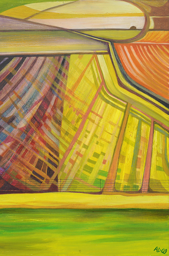 An abstract, mixed media piece (oil, ink, pencil and pastel) of a cross section of ploughed fields taken from a maze of fields near Alton Barnes in Wiltshire.